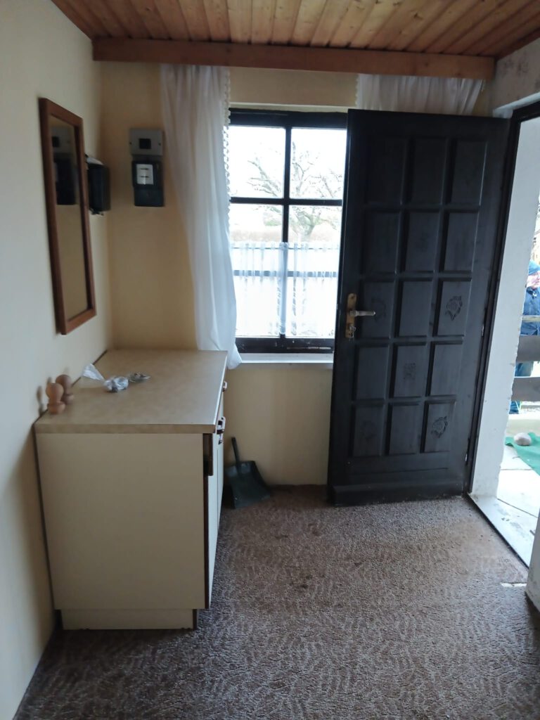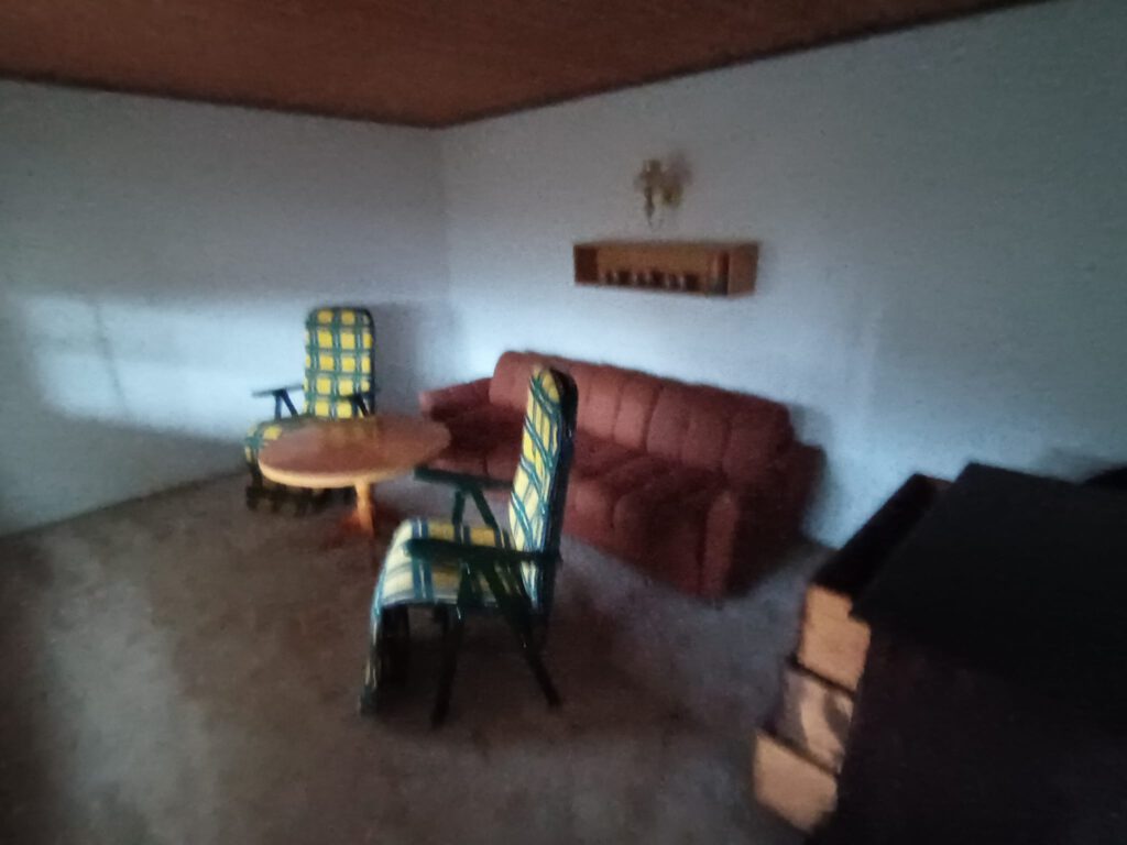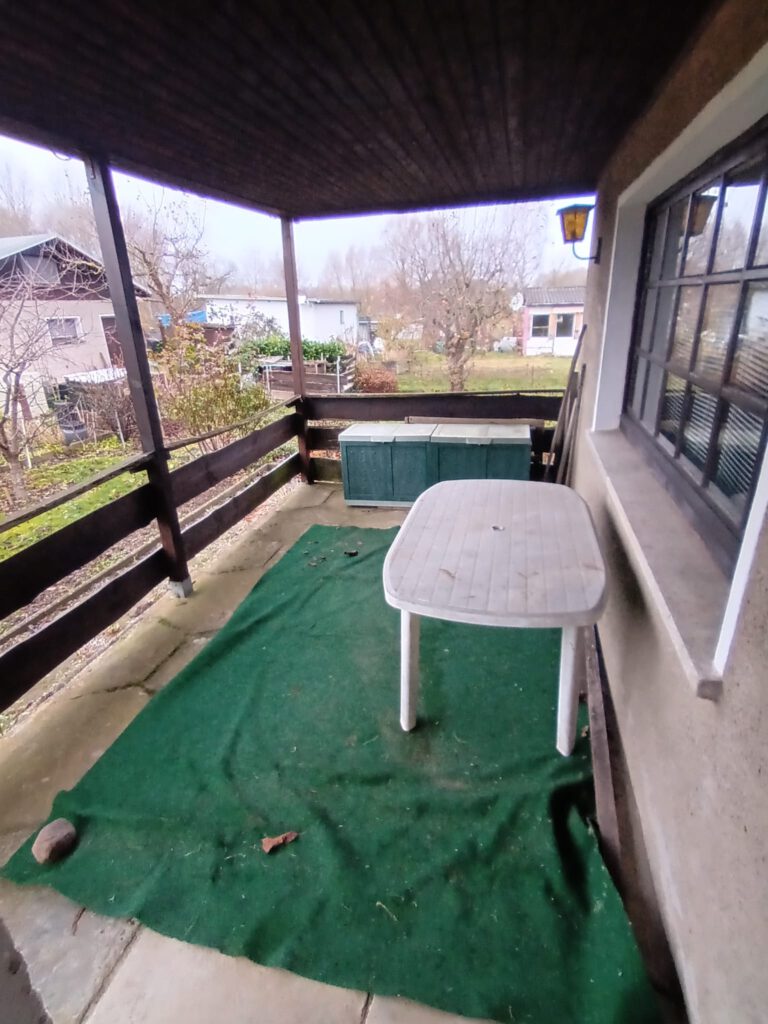 Die Laube hat ein Zimmer, eine Küche, ein kleines Bad und eine Terrasse, welche 14,8 m² groß und überdacht ist.