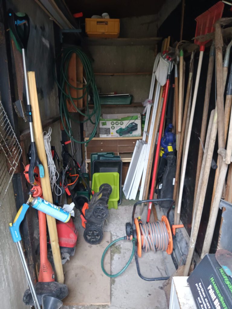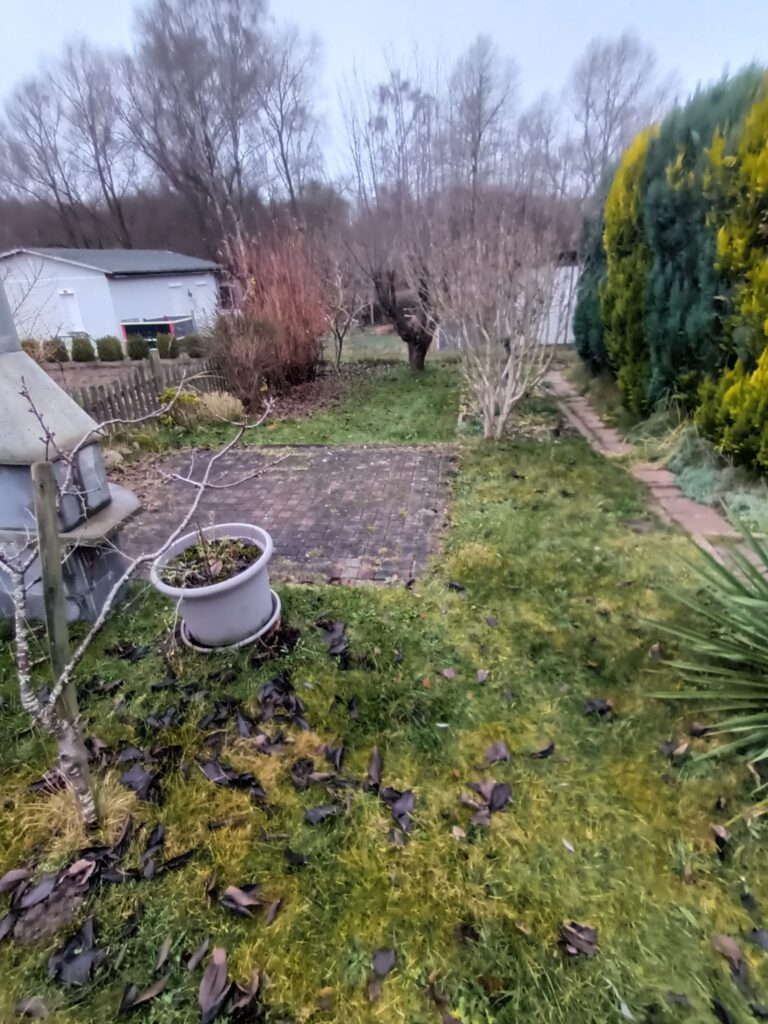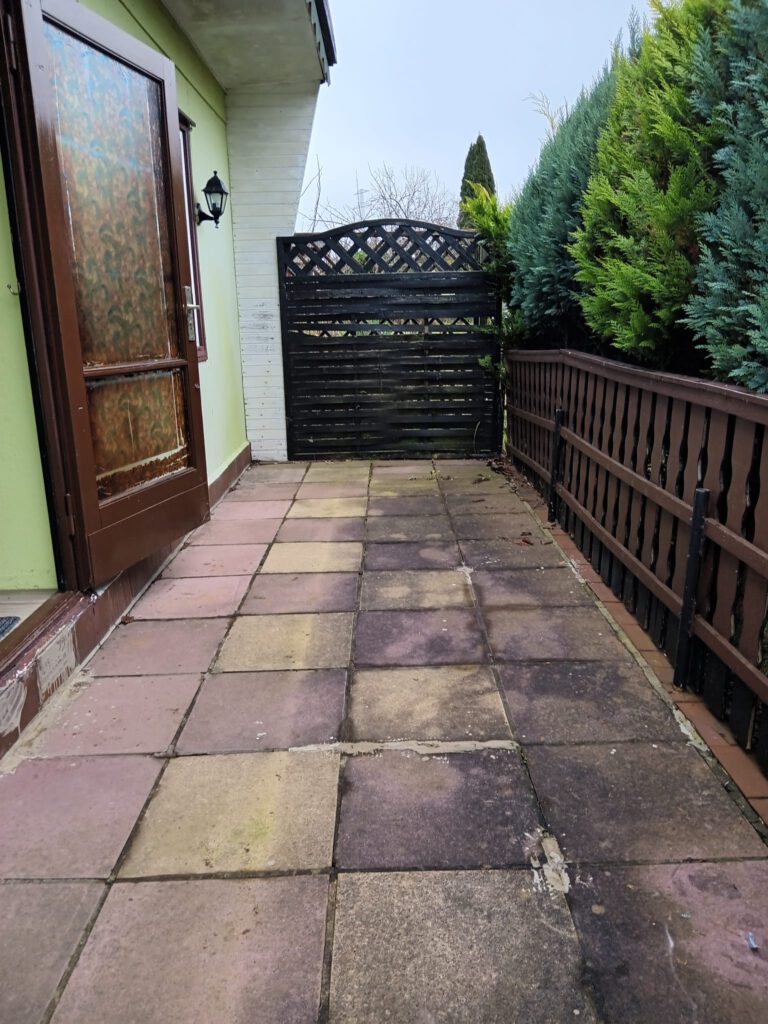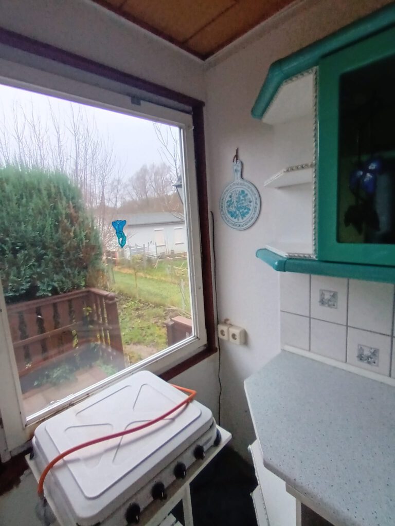 Die Laube ist eine Fertigteil-Laube von Typ B 22. Der Zustand der Laube ist gut. Die Laube hat ein Zimmer, eine Küche, ein kleines Bad und eine Terrasse.